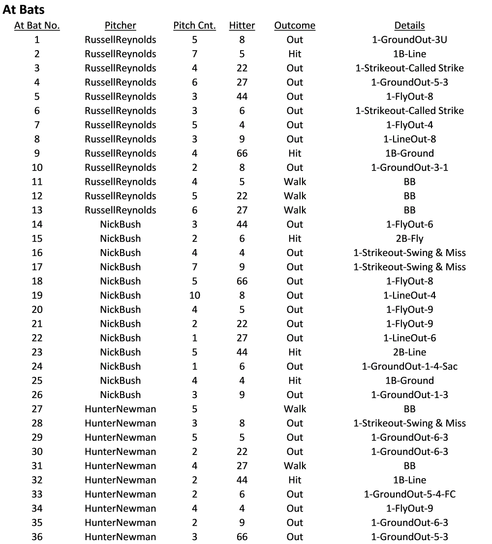 Hunter Newman finished the game going 2 1/3 accumulating a Strike% of 66 through 32 pitches, 7 of which were First Pitch Strikes.