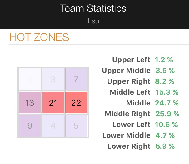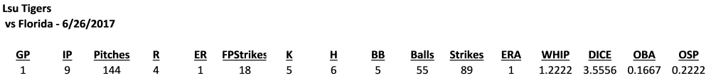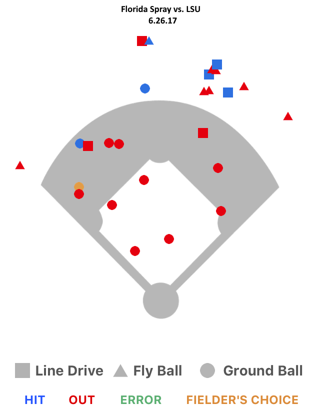 Below is the LSU Pitching Line/Hot Zones and the Florida Spray for Game 1: