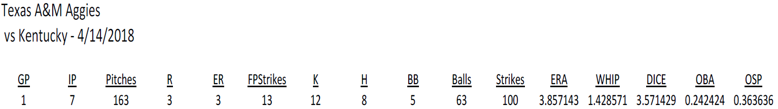 In the circle, Kayla Poynter started for the Aggies and exited after only an inning and 2/3. Poynter tossed 44 pitches and gave up 3 runs on 4 hits while posting 4 First Pitch Strikes and a Strike % of 68.18