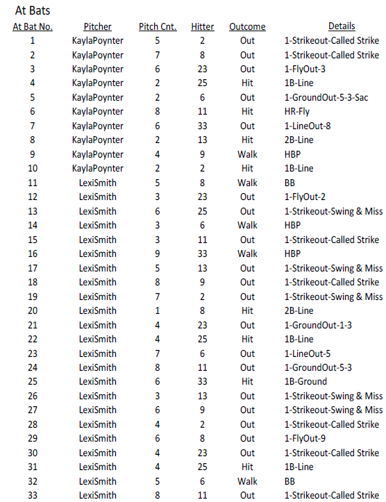 Lexi Smith took over and pitched 5 1/3 shutout innings while striking out 10. Smith ended the contest with 119 Total Pitches, 9 First Pitch Strikes, a Strike % of 58.82 and the W.