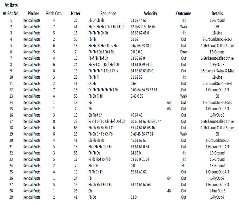 Potts faced 29 Hitters with 118 Pitches, timing the offspeed to produce 8 outs when the ball velocity dropped from ~63 to ~48: 4- Called Strike Strikeouts/1- Swing-Miss Strikeout and 3- outs in the field--- all outcome victims of the change in speed.