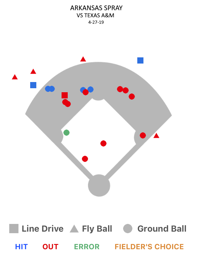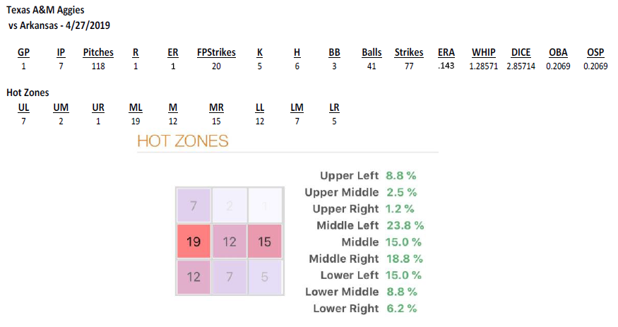 Kendall averaged 4 Pitches/Hitter, whipped in 20 First Pitch Strikes in 7 frames and ended the contest with a Strike % of 65.25. The Aggie defense held strong behind their pitcher as they whipped up 2 double plays. One, a bases loaded 1-2-2-3 following 2 Singles and a Walk to keep the Razorbacks off the board in the First.