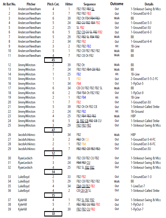 Anderson Needham got the starting nod from Coach Rodriguez on Sunday, lasting 2 inning- giving up 3 runs. Luke Boyd, Ryan Leckich, Jacob Ashkinos and Kyle Hill all made appearances with Leckich having the high Strike % of 71.4.